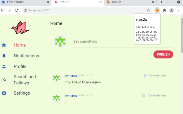 git clone https://github.com/fiatjaf/nos2x && cd nos2x && yarn && yarn run buildthen load as unpackaged on chrome://extensions with "developer mode" enabled